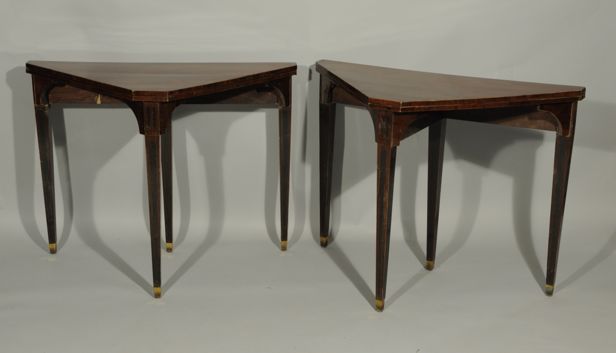 Paire de TABLES à JEU repliables en acajou et incrustations d'ébène. Plateau découvrant un tissu vert à bordure de grecques dorées. Coins coupés. Quatre pieds gaines, dont un mobile, à cannelures simulées. Sabots en laiton.