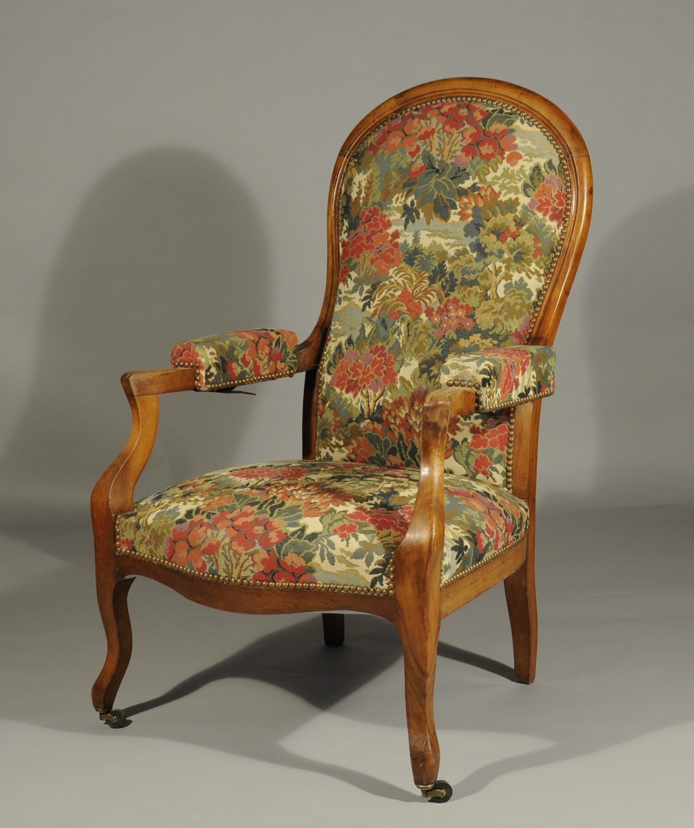 - FAUTEUIL dit "voltaire" à dossier basculant en noyer mouluré. Il repose sur quatre pieds, les pieds antérieurs galbés à roulettes.