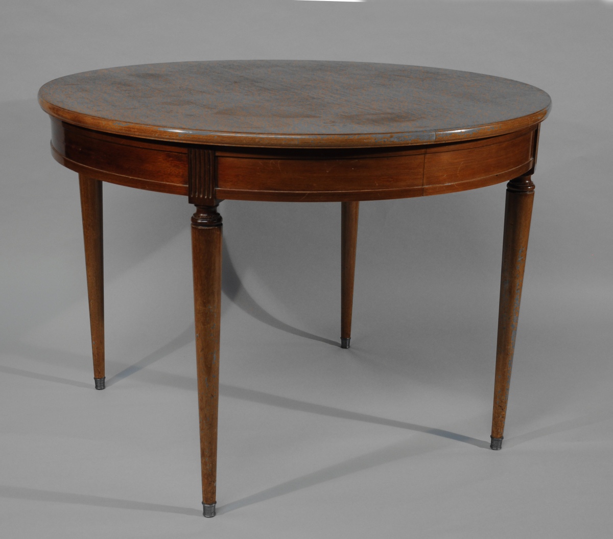 JOINT: TABLE DE SALLE À MANGER de forme circulaire en bois naturel et placage. Repose sur quatre pieds gaine à sabots de laiton. Haut. 75, Diam. 104 cm. Avec trois rallonges de 40 cm.