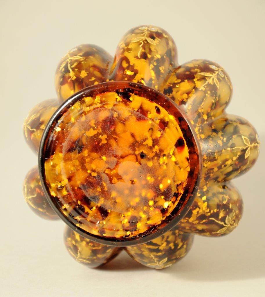 CLICHY? VASE à panse godronnée et haut col quadrilobé en verre moucheté jaune, brun et rouge agrémenté de paillettes d'or. Décor émaillé or argent de motifs floraux stylisés.