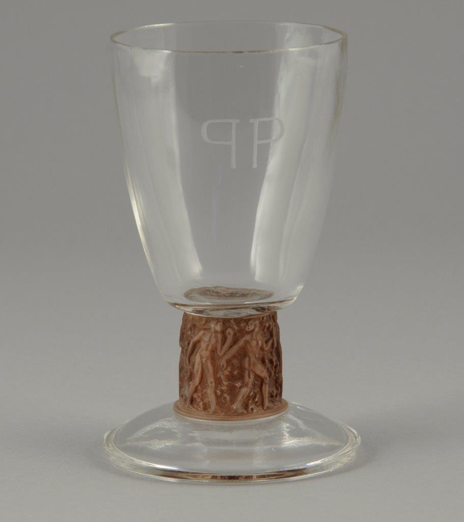 Verre blanc, paraison soufflé-moulé, jambe moulé-pressé patiné. Monogrammé "PP".