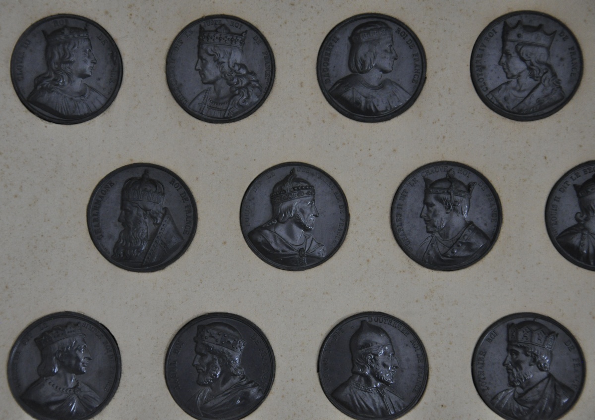 Inspiré par la collection de médailles des rois de France commandée par de Launay, dont les coins avaient été gravés par Thomas Bernard au XVIIIème siècle, Armand Auguste Caqué, mandaté par Madame La Dauphine, éxécute la fameuse "Galerie numismatique des rois de France", ensemble de 74 médailles qui est exposé au Salon de 1836 à 1839.