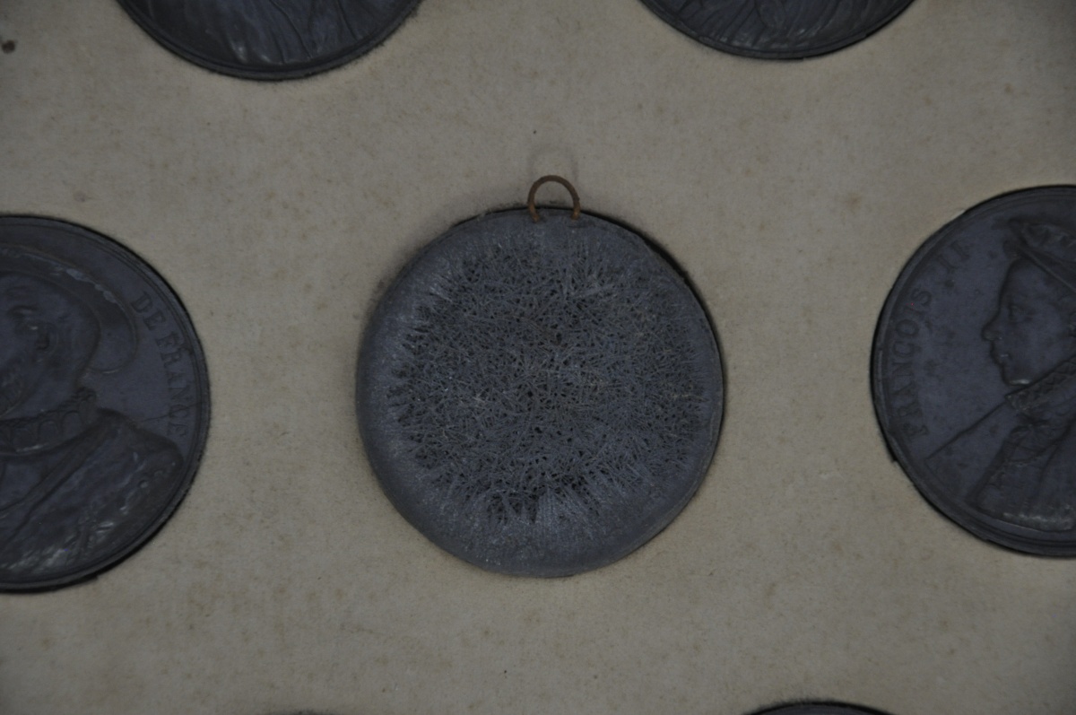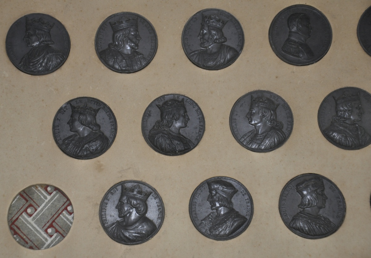 Médaille: Diam . 5 cm. (deux emplacements vides: Philippe II et Napoléon II (?) ; deux médailles abîmées: Louis XVIII et Charles X).