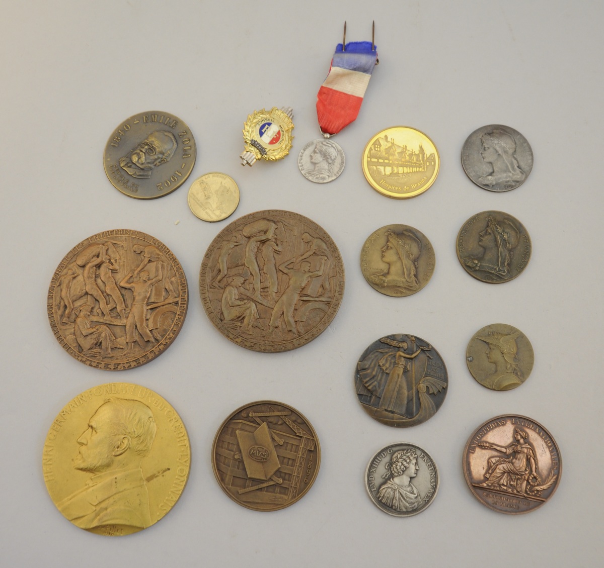Une en argent au profil de Louis XIV commémorant le traité des Pyrénées. Les autres en bronze ou métal patiné, doré ou argenté telles que 2 de la "Fédération Nationale des entreprises à Commerces Multiples", une à l'effigie de Henri-Germain, Fondateur du Crédit Lyonnais, une de la ville de Paris de 1933, une de l'Exposition Internationale de Londres de 1874, une des Hospices de Beaune...