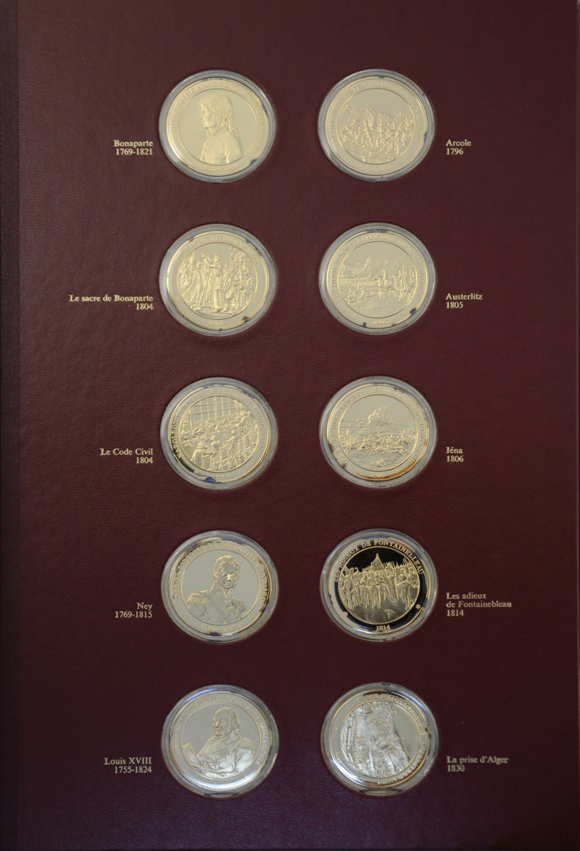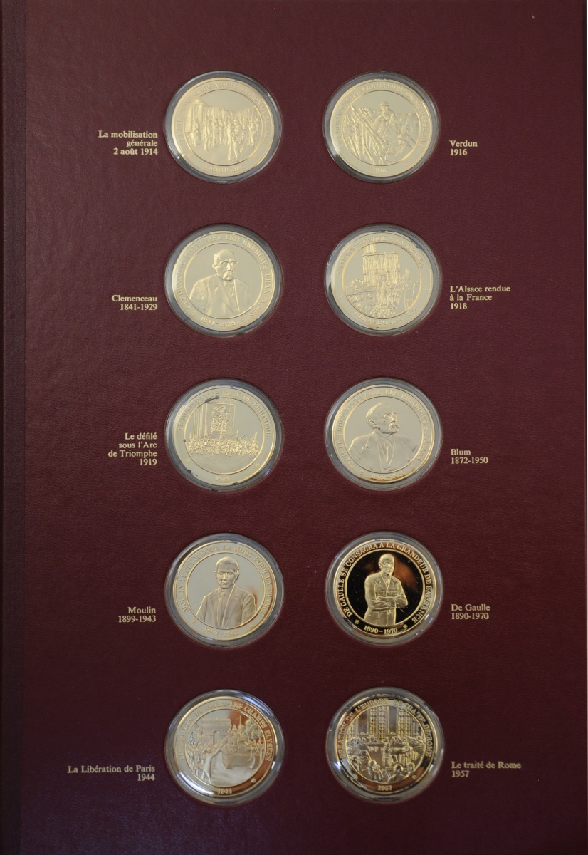 ANCIEN-REGIME. "L'HISTOIRE de FRANCE en MÉDAILLES", Le Médailler, tirage de 1954, Paris. Tome I et II. DEUX ALBUMS comprenant 98 MÉDAILLES en vermeil, Diam. 4,3 cm. Tome I: de Clovis à Jean-Jacques Rousseau, 48 médailles (deux manquantes: Descartes et La Bataille de Fontenoy). Tome II: de Beaumarchais au Traité de Rome, 50 médailles. Poinçon crabe et poinçon d'orfèvre. Certificat d'authenticité signé par Patrick Petit, Président Le Médailler. Poids: environ 3690 g.