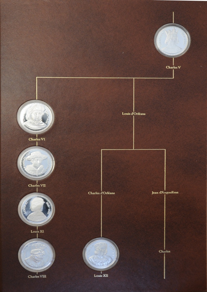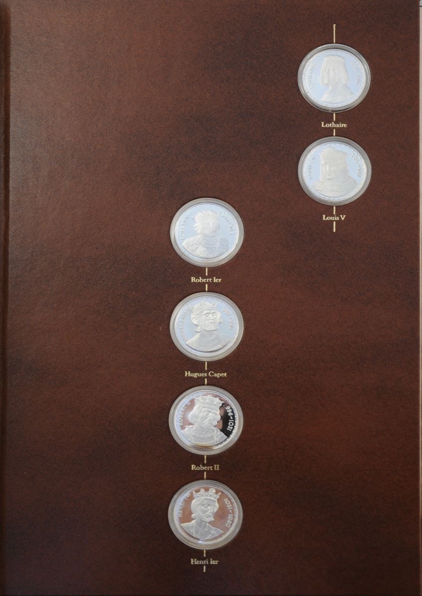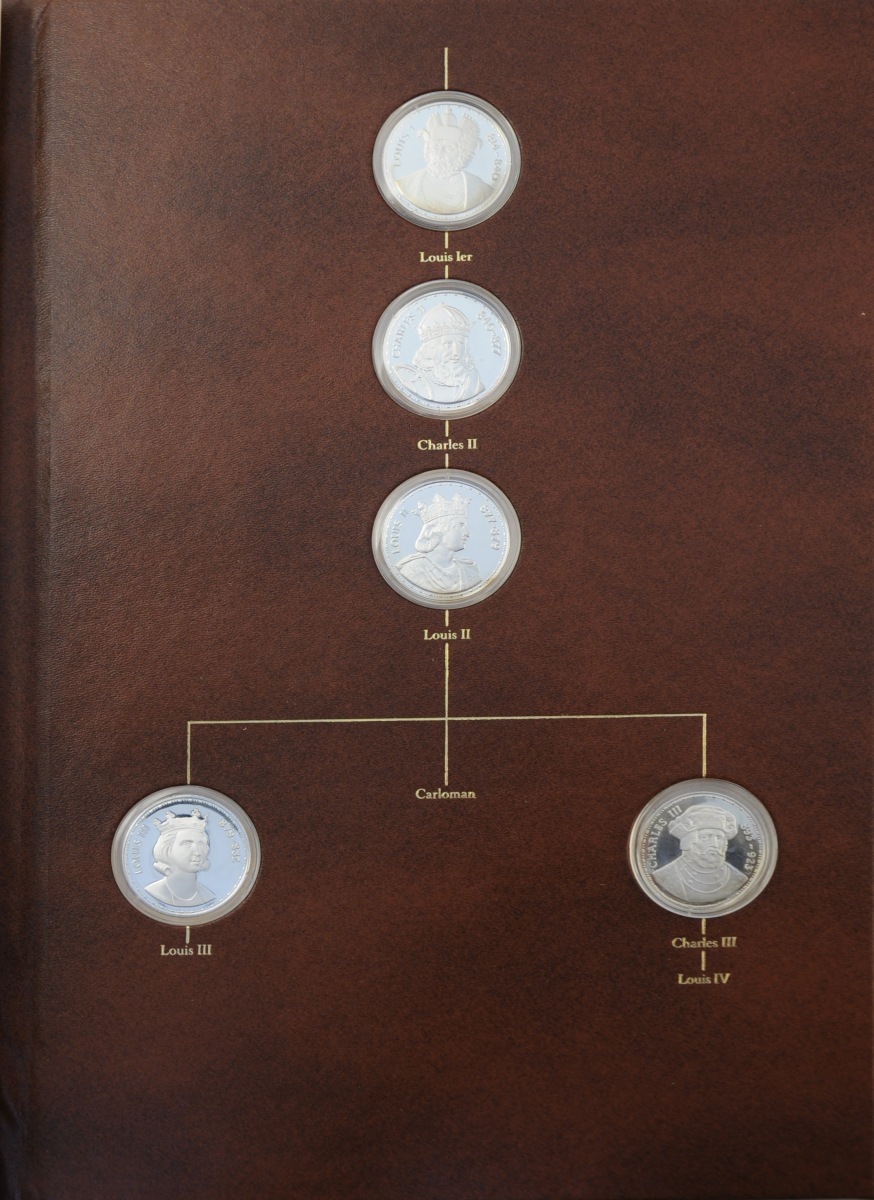 ALBUMS comprenant 46 MÉDAILLES en argent, Diam. 3,8 cm. De Clovis à Louis-Philippe Ier (deux manquantes: François II et Louis-Philippe Ier). Avec 20 notices biographiques. Poinçon crabe et poinçon d'orfèvre. Poids: environ 950 g.