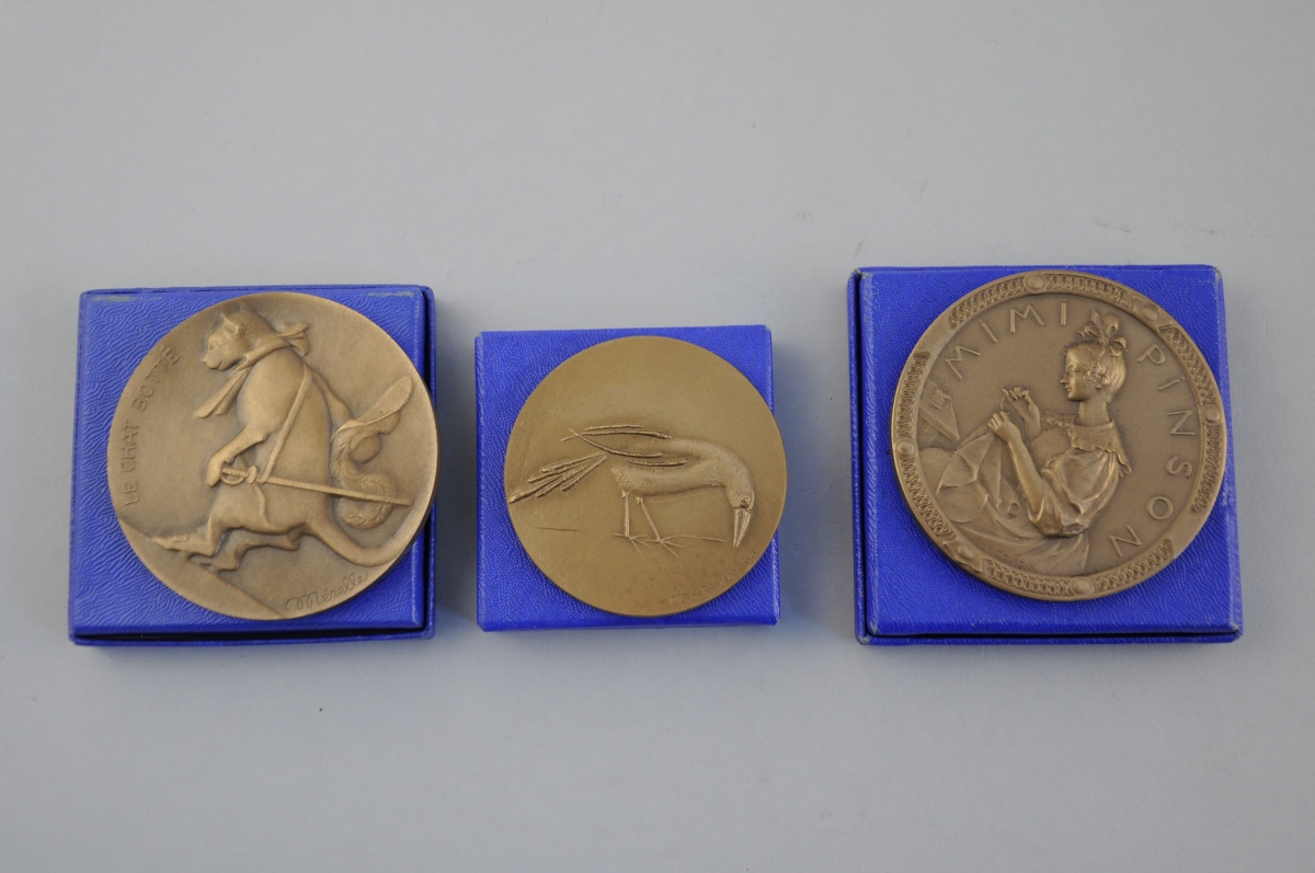 LITTERATURE. LOT de 2 MÉDAILLES en bronze à l'éffigie de personnages de contes: Mimi Pinson et le Chat Botté. Signées "Anie Mouroux" et "Mérelle". Poinçon de la Monnaie de Paris. Seconde moitié du XXème. Diam. moyen 7 cm.