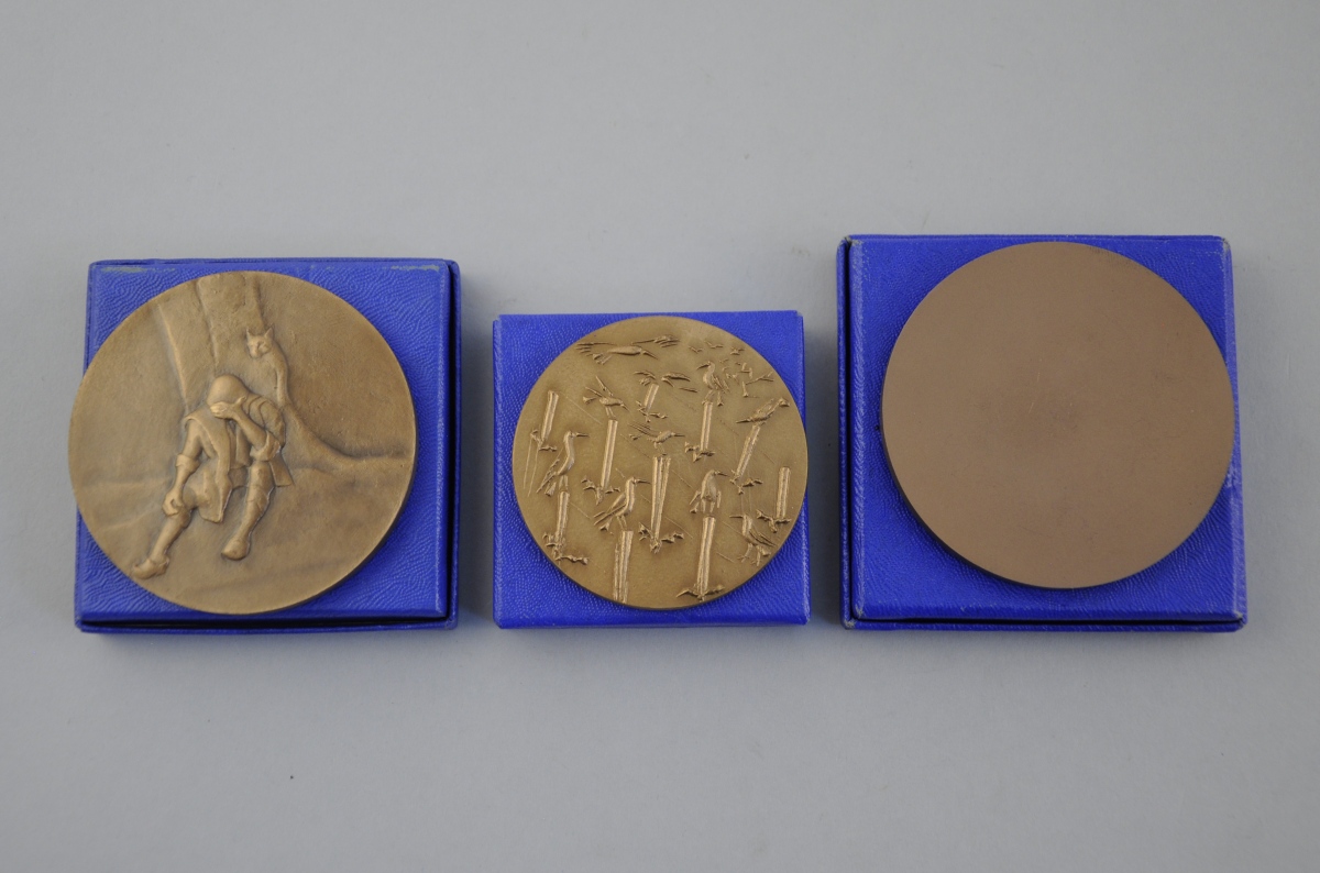 JOINT: MÉDAILLE en bronze. Oiseaux. Signée "P. Poitevin" et daté "68". Poinçon de la Monnaie de Paris. Seconde moitié du XXème. Diam. 5,7 cm.