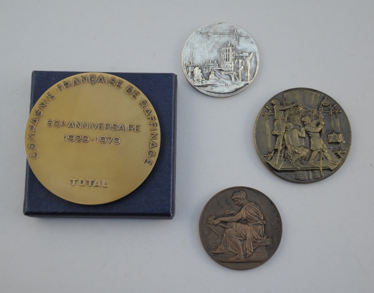 ASSOCIATIONS. LOT de 3 MÉDAILLES en bronze et d'1 MÉDAILLE en argent sur le thème du travail: TOTAL "50e anniversaire 1929-1979", "Fédération Parisienne du Bâtiment / René BALLON 1962", "Chambre Syndicale des Fermetures / R. BALLON 1965" et "Fermetures F.M.B Vendôme / BALLON René 1945". la première dans sa boîte. Seconde moitié du XXème. La plus grande, Diam. 8 cm.