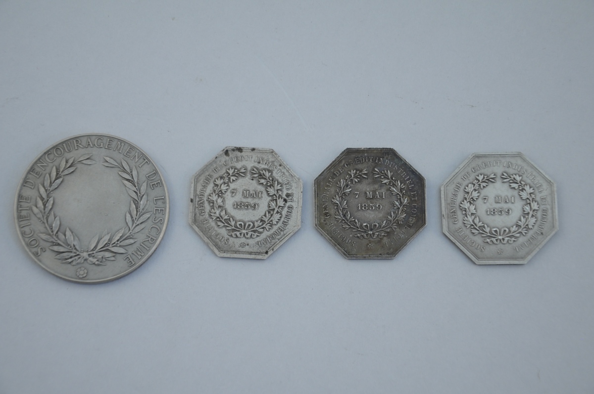 -Trois jetons octogonaux Société Générale de Crédit Industriel et Commercial, 7 mai 1859. Face représentant une allégorie. Poids brut total: 63,2 g.
