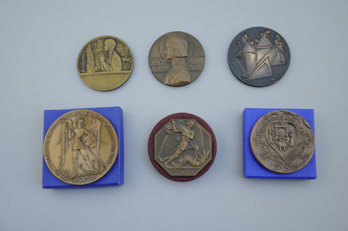 - La deuxième: Médaille du millénaire du Mont Saint-Michel. A/ Saint Michel Archange terrassant le dragon. Signature M. Charon. R/ Vue du Mont Saint-Michel. .CMLXVI . MCMLXVI.
