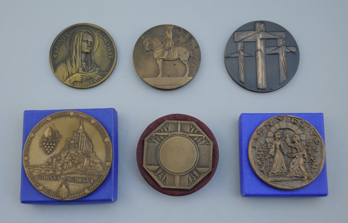 -La sixième: A/ Sainte Geneviève tenant la nef. Signature Becker. R/ Sainte Geneviève en prière. Diam. 6 cm.