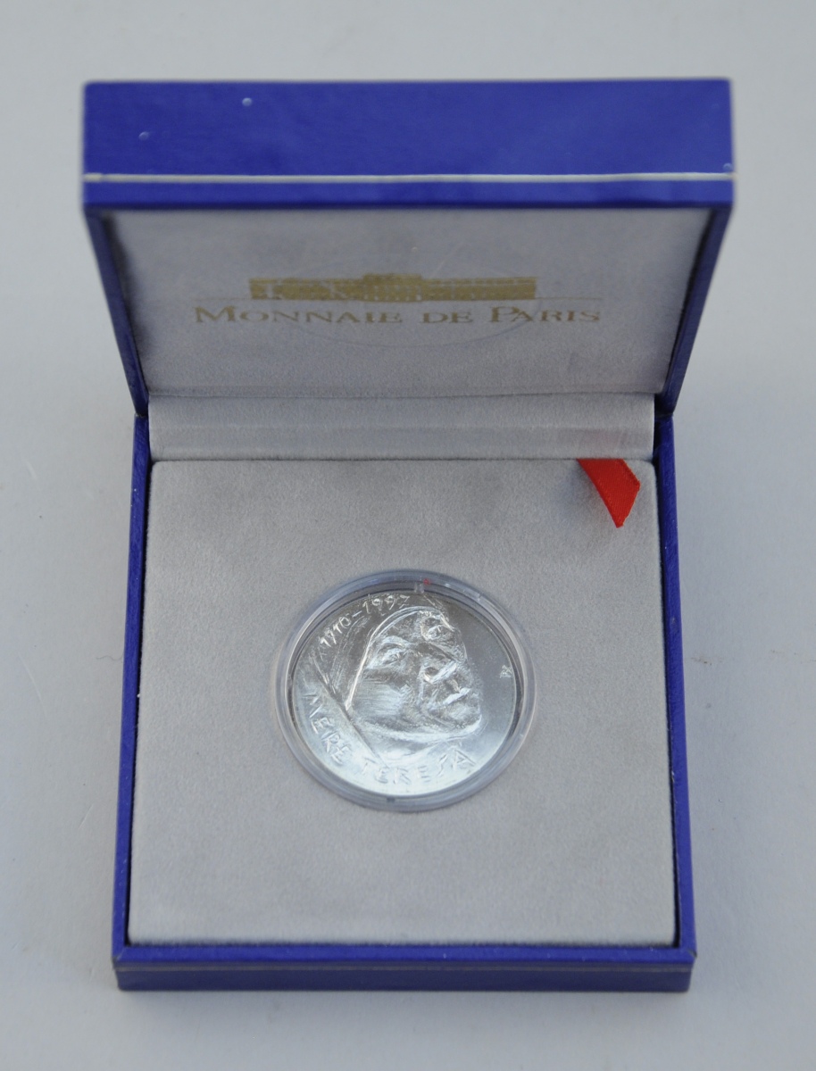 RELIGION. MÉDAILLE en argent à l'effigie de Mère Thérésa (1910-1997). Le revers uni. Édition de la Monnaie de Paris. Diam. 3,5 cm. Poids: 18,8 g. Écrin de la Monnaie de Paris.