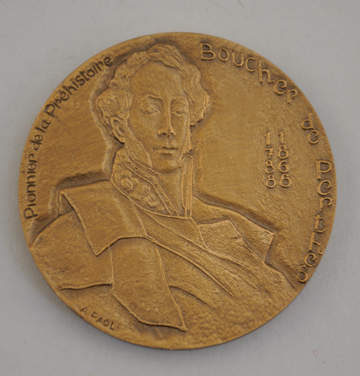 [BOUCHER DE PERTHES PIONNIER DE LA PRÉHISTOIRE]. Médaille commémorative du fameux préhistorien français: "Pionnier de la Préhistoire Boucher de Perthes", par A. Paoli. Diam. 7 cm.