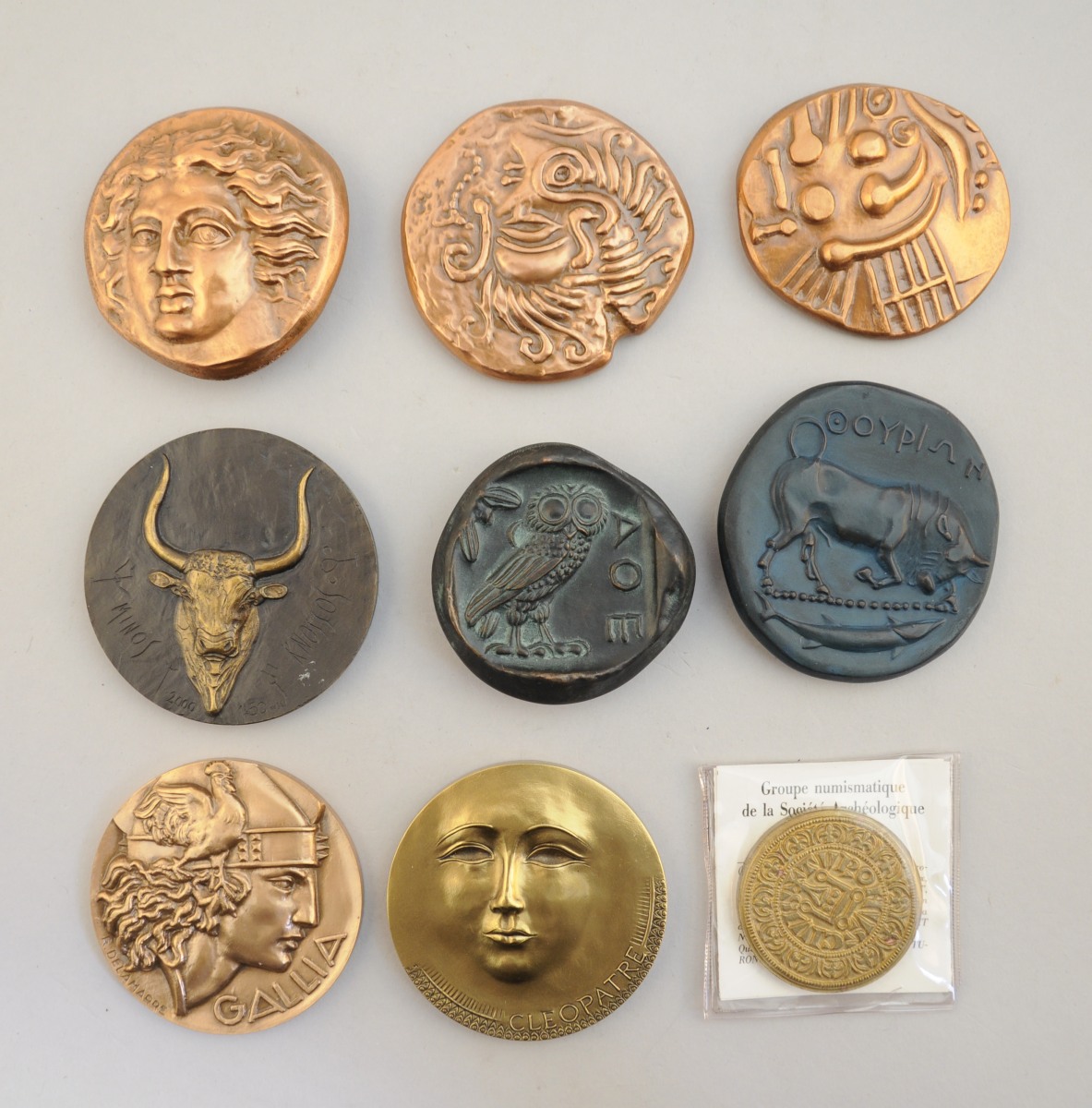 [ANTIQUITÉ]. 9 médailles réplicant motifs antiques. "Minos Knossos", par Birr; "Cléopatre", par Mayot; "La livre Tournois", commémorative du 50e anniversaire de la Société Archéologique de Touraine; "Gallia", par Delamarre; et 5 médailles au motifs de la Grèce Ancienne.