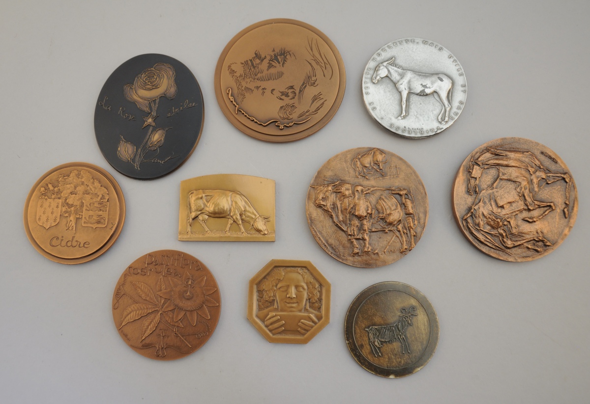 [NATURE]. 10 médailles commémoratives: Vache et paysage, par Delandre; Vaches, par Debus; "Petite noblesse, mais utile et sans faiblesse", par Baron; "Cheval", par Debus; Chèvres, par Auricoste; "Bacchus", par Torlon; "Passiflora Coerulea", par Quillivic; "La rose étoilée" (signature non lisible); "Le cidre", marquée ML; et "Plantez Paix Amoir Liberté Romarin" (signature non lisible).
