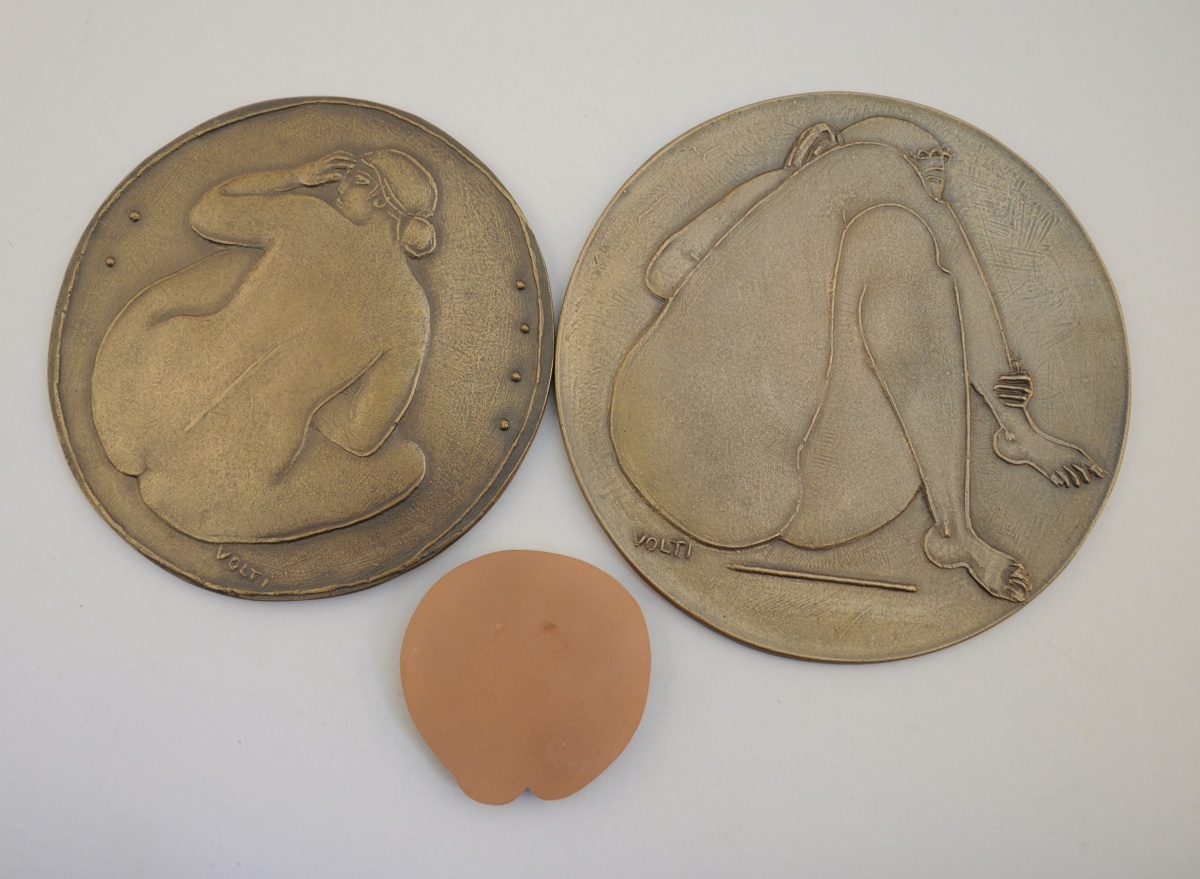 [MÉDAILLES ARTISTIQUES]. Collection de 3 médailles créatives à différents motifs: 2 grandes pièces représentant des femmes nues, par Volti, et Buste de femme aux animaux (signature non lisible).
