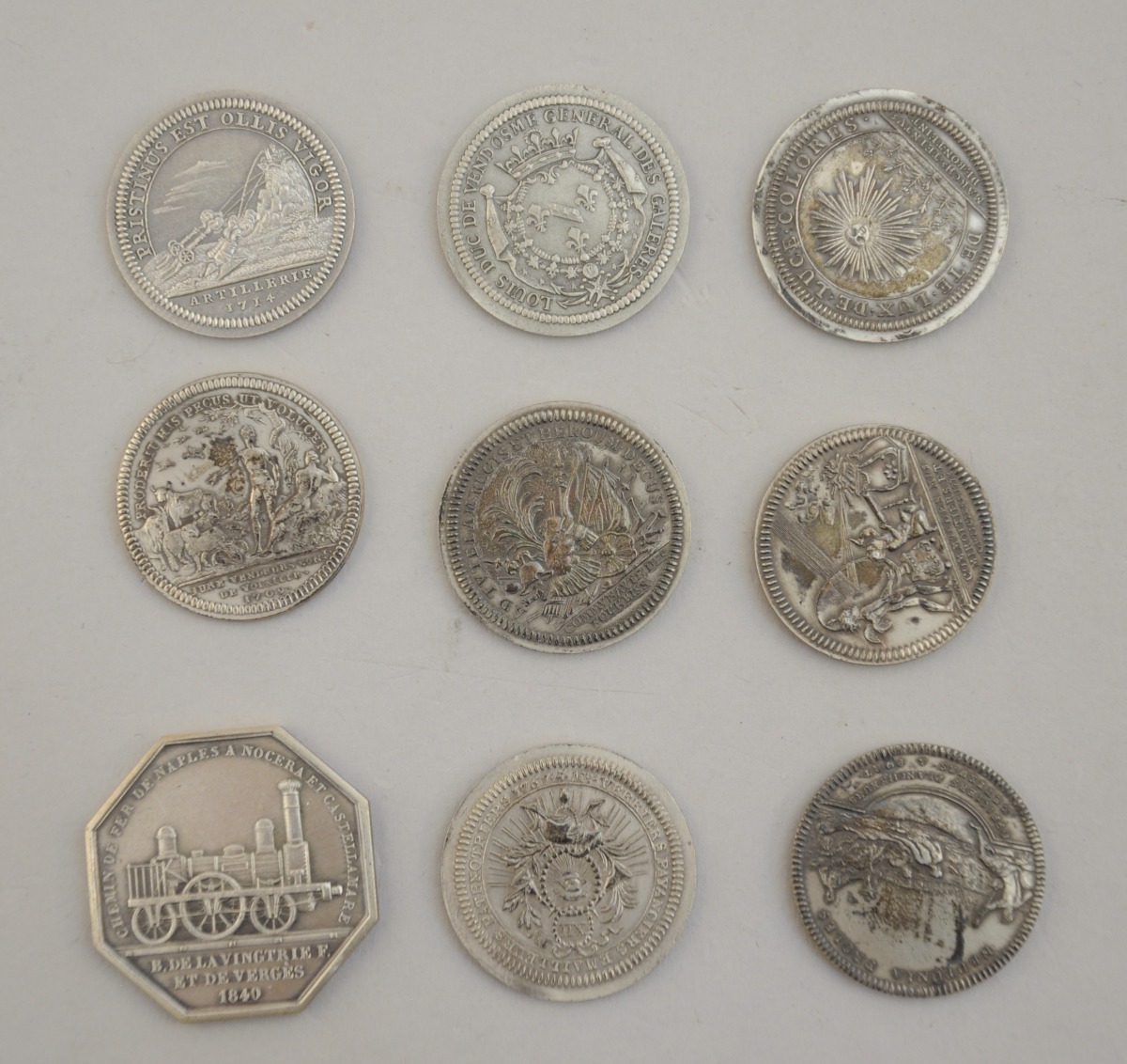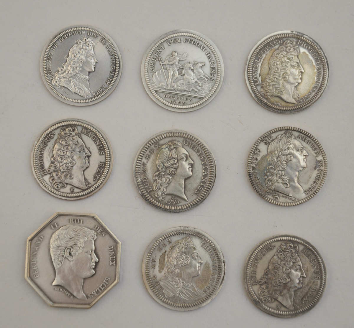 [MONARCHIE FRANÇAISE]. 9 médailles en argent référentes à la monarchie française: Louis le grand, Louis XV (2), le duc du Mayne, le Duc de Vendôme, Ferdinand II, roi des Deux Siciles, Louis X, Ludovicus Magnus (2).