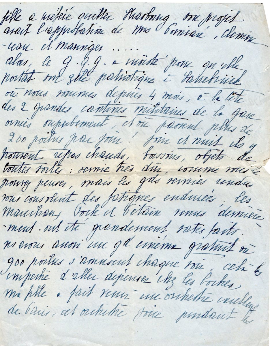 ) Alors le G.Q.G. a insisté pour qu'elle portât son zèle patriotique à Sarrebruck où nous sommes depuis 4 mois, à la tête de 2 grandes cantines militaires de la gare ornées superbement et où passent plus de 200 poilus par jour! Jour et nuit ils y trouvent repas chauds, boissons, objets de toutes sortes ; service très dur comme vous pouvez le penser mais les grands services rendus nous consolent des fatigues endurées. Foch et Pétain venus dernièrement ont été grandement satisfaits. Nous avons aussi un grand cinéma gratuit où 900 poilus s'amusent chaque soir, cela les empêche d'aller dépenser chez les boches. Ma fille a fait venir un orchestre excellent de Paris (