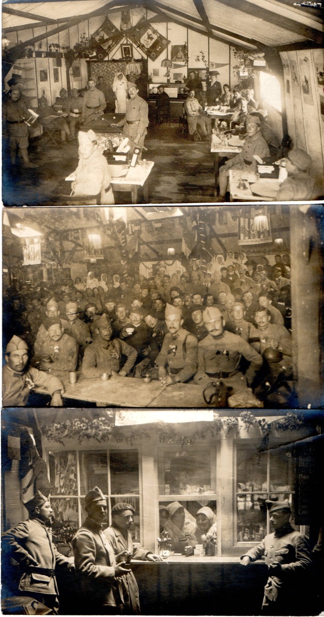 ) le succès est immense! c'est par centaines que ma fille reçoit des lettres de poilus reconnaissants de ses bontés!... " et 5 cartes photos: cantines, magasin et salle de détente.