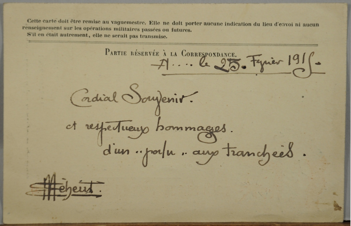 L.A.S., aux armées, 25 février 1915 à Madame Jeanne Dutilh. 9 x 14,4 cm.