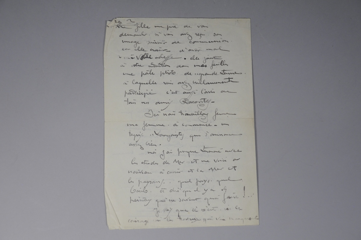 Mathurin Méheut envoie quelques nouvelles de sa famille: "Ici nous travaillons ferme. Ma femme a commencé un tapis. Moi j'ai presque terminé avec les études de Mer et me voici à nouveau à courir et la mer et les paysans
