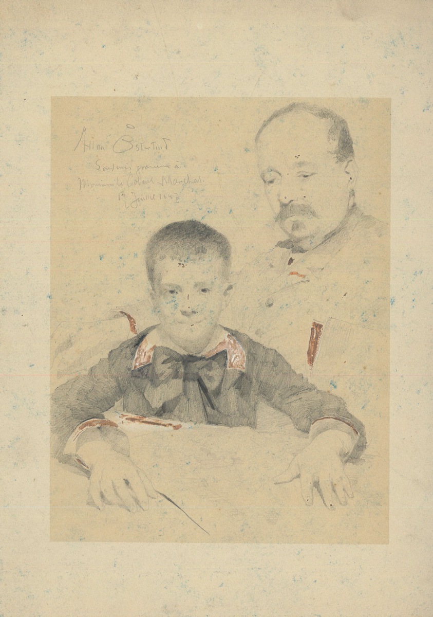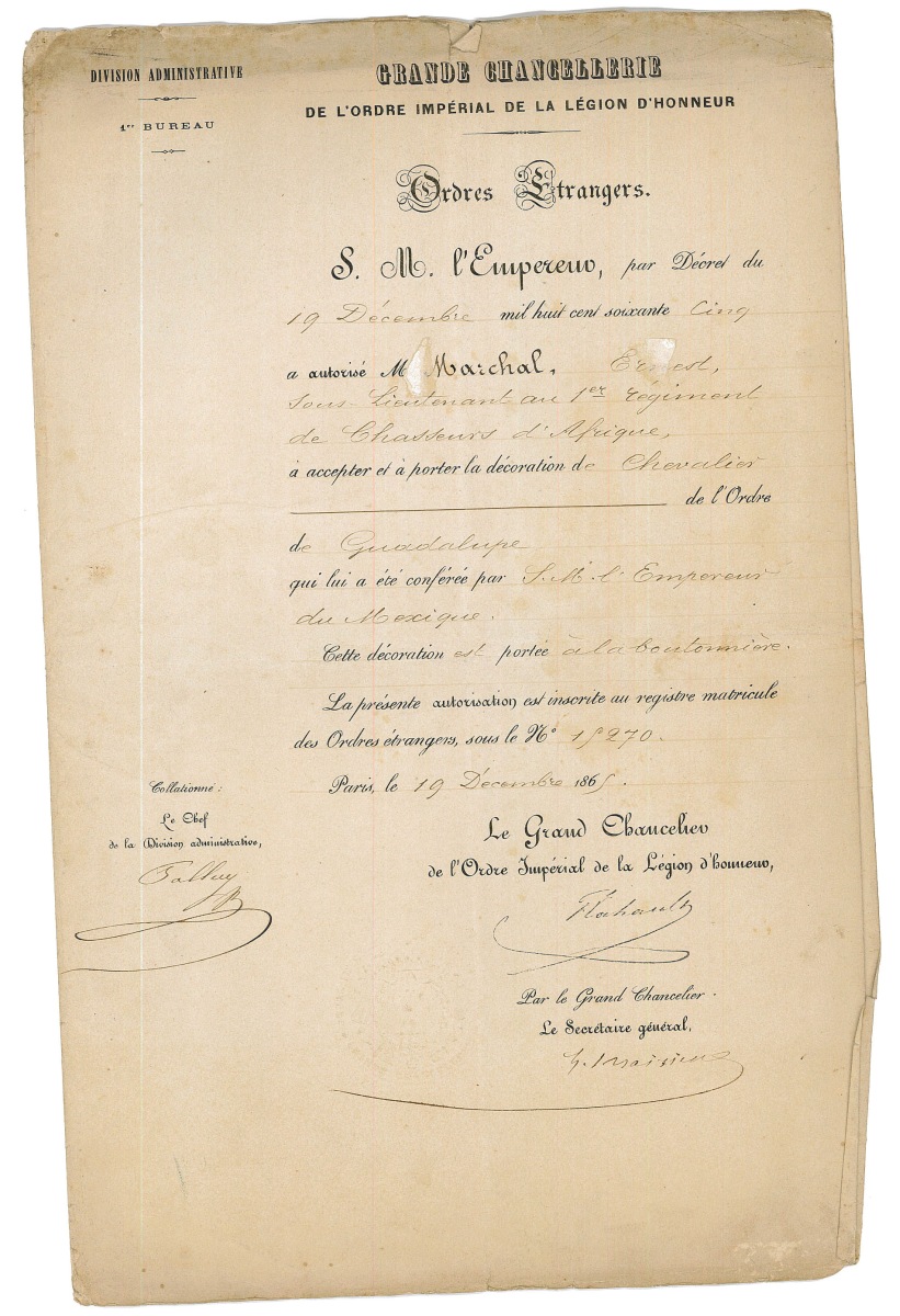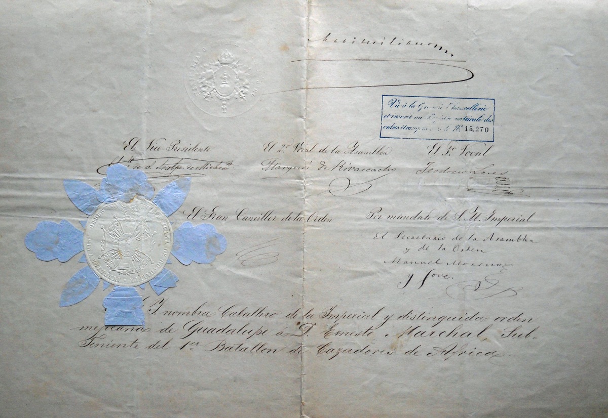 Réunion de + de 65 pièces (L.S., L.A.S., P.S. et divers) concernant la carrière militaire d'Ernest MARCHAL: 8 pièces relatives à sa carrière d'officier et à la campagne du Mexique dont diplôme de chevalier de l'ordre impérial mexicain de Notre Dame de Guadalupe signé par Maximilien Ier empereur du Mexique daté du 15 décembre 1864 avec cachet à sel ; lettre de la grande chancellerie donnant l'autorisation de porter la médaille de l'ordre mexicain, datée du 19 décembre 1865 et décorée d'une belle représentation en couleurs peinte de la médaille ; diplôme de la médaille commémorative de l'expédition du Mexique, 1864 - 46 pièces relatives à la campagne de 1870-1871 dont notes, ordres et correspondance adressées au lieutenant-colonel Marchal par le quartier général de la 3e division du 24e corps d'armée (dont L.S. du général Carré de Busserolles) - 5 pièces relatives à la promotion de chevalier de la légion d'honneur dont diplôme du 14 janvier 1872 - 9 pièces relatives au dépôt d'un brevet d'invention d'obus à charge de fulmicoton déposé par Marchal et Jardoux en 1887 - Portrait photographique d'Ernest Marchal par un studio londonien, 15 x 11,5 cm hors cadre - Portraits au crayon et rehauts d'Ernest Marchal et d'un enfant, avec envoi manuscrit daté du 17 juillet 1887 et signature d'Allan Österlind.