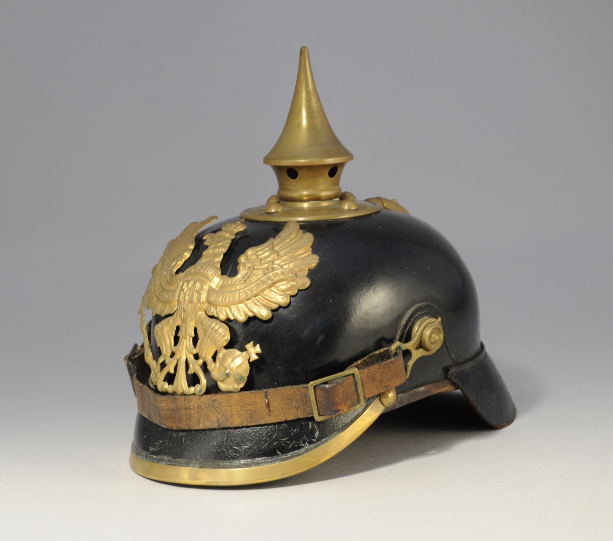 PRUSSE. CASQUE À POINTE. Bombe en cuir et garnitures de laiton. Coiffe intérieure et jugulaire en cuir. (cocardes manquantes)