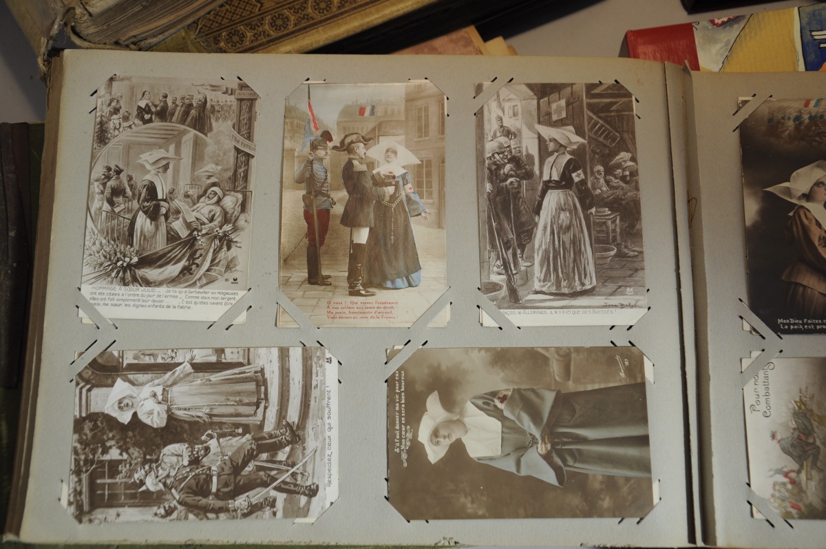- album D. plus de 850 CP: drapeaux français, les Alliés, début de la guerre, défaites allemandes, drapeaux capturés, patrie honneur gloire, Déroulède, uniformes bleus, la Marseillaise, taisez-vous, emprunts, journée du poilu, restrictions, scènes de guerre, tranchées, attaques, photos de soldats, groupes, Noël, armée 1920-39, ruines, exode, vaguemestres, inhumations, prisonniers, bombardement de Paris...