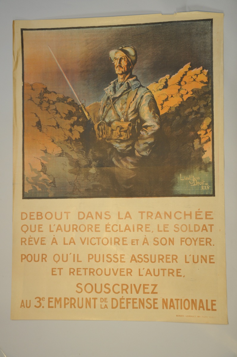 "Debout dans la tranchée que l'aurore éclaire, le soldat rêve à la victoire et à son foyerpour qu'il puisse assurer l'une et retrouver l'autre, souscrivez au 3e Emprunt de Défense Nationale"