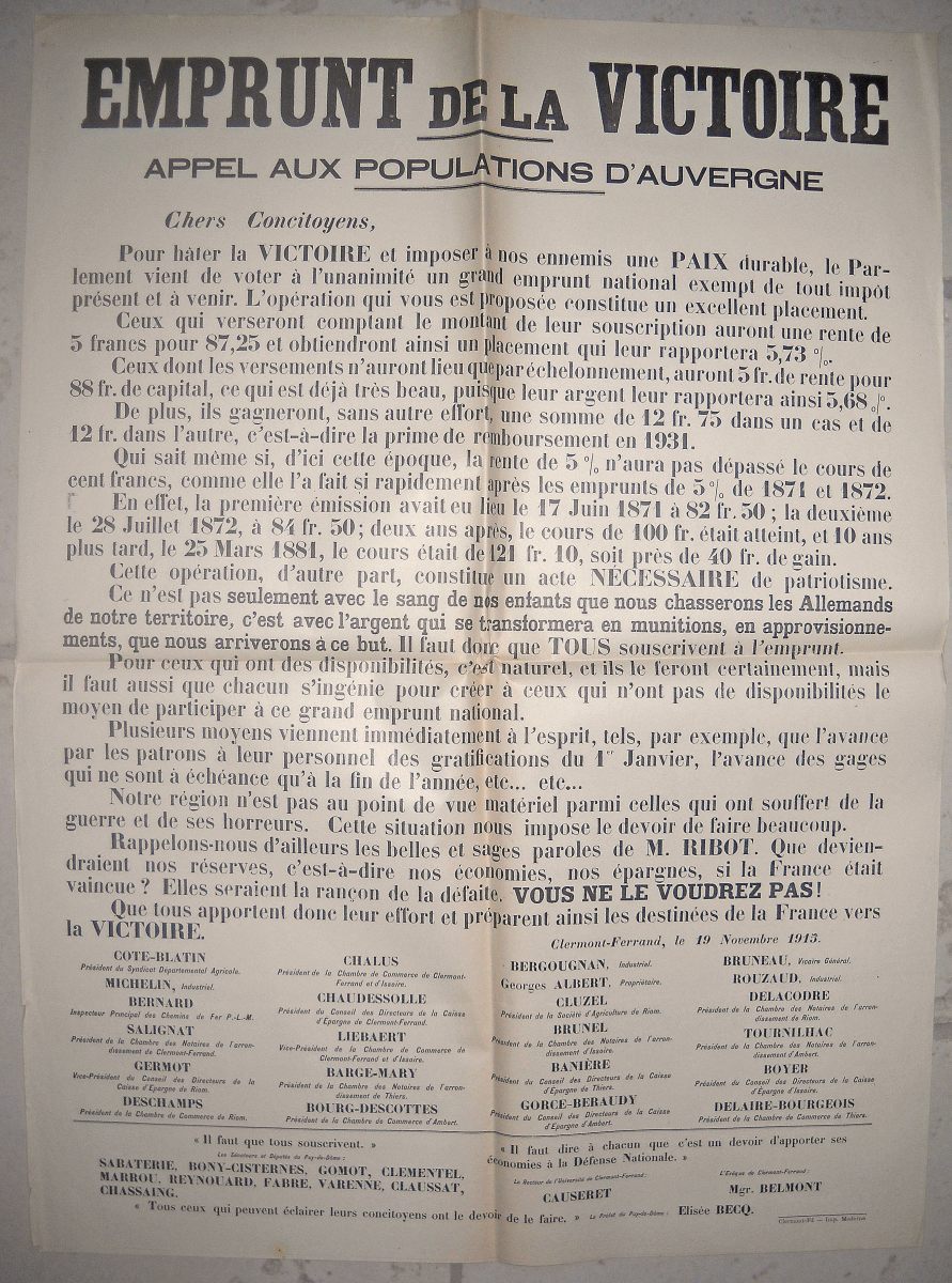 2 affiches: " Emprunt de la libération. On les a. Souscrivez à la London County and Westminster Bank (Paris) " par Firmin Bouisset, Impr. de Vaugirard Paris, 59 x 39 cm, état moyen - 2 affiches à texte: " Emprunt de la victoire. Appel aux populations d'Auvergne ", 76 x 56 cm, T.B.E. - " Emprunt de la libération. Appel des maires de France ", Maquet Gr. Paris, 44 x 28,5 cm, B.E.