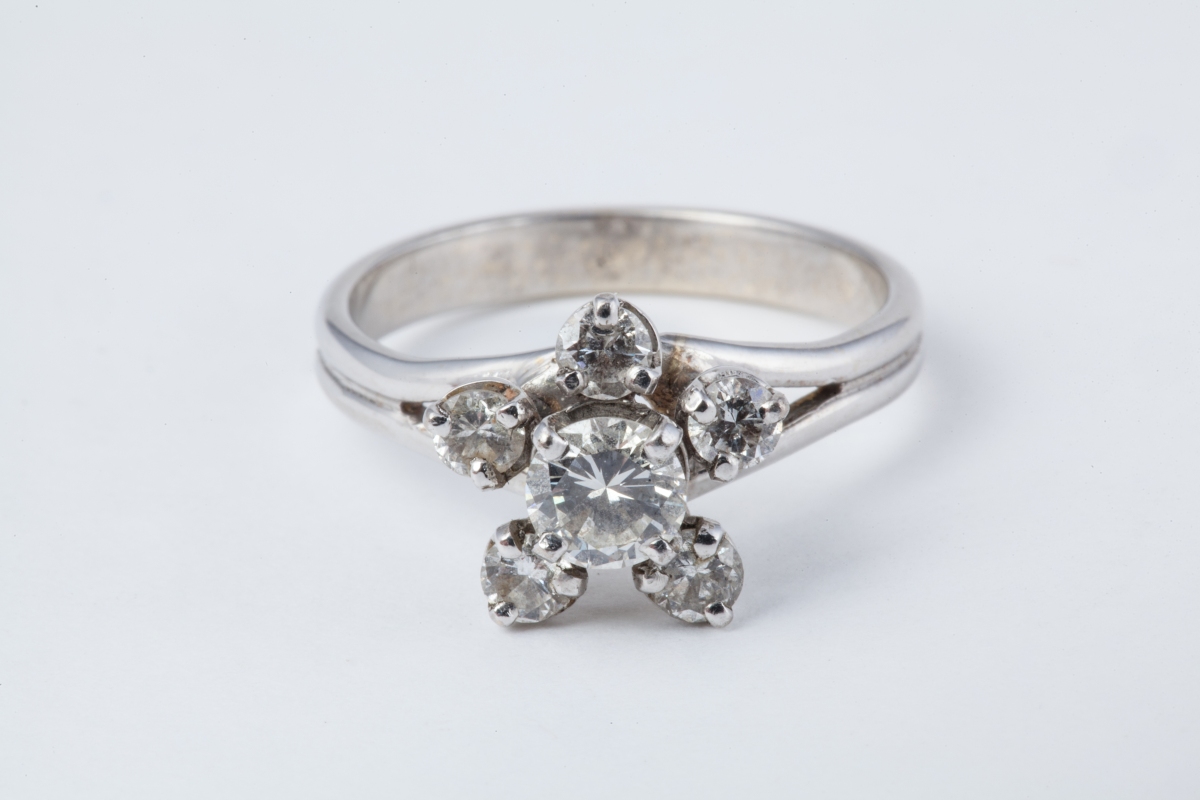 BAGUE "fleur" en or gris 18K ornée de six DIAMANTS ronds de taille brillant, celui du centre plus important.