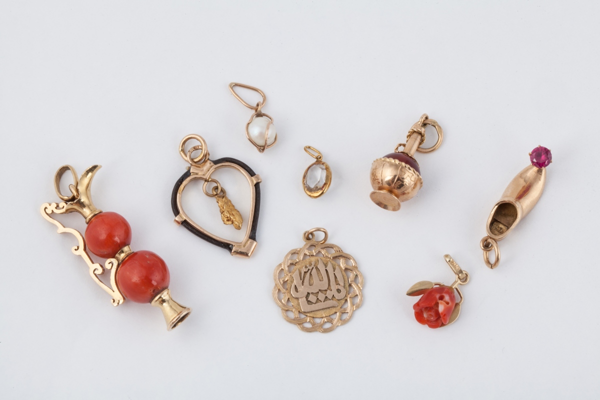 8 PENDENTIFS "ORIENTAUX" en or jaune et pierres dures ou fins montées en bouteille, bouton de rose, aiguière, perle enchassée, babouche, médaillon religieux, pépite...