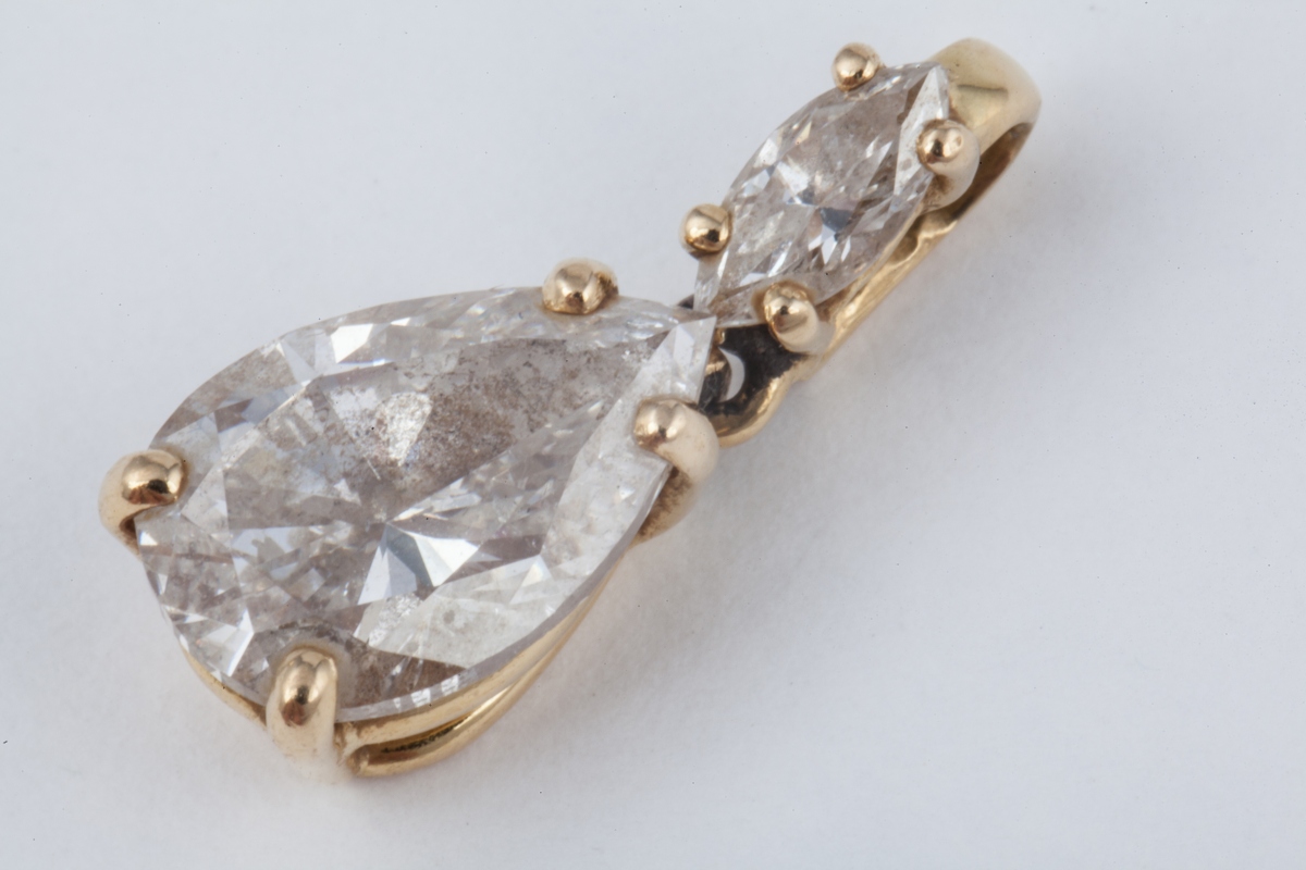 PENDENTIF en or jaune 18K orné de deux DIAMANTS, l'un d'entre eux plus important de forme poire. (Petit manque au diamant).