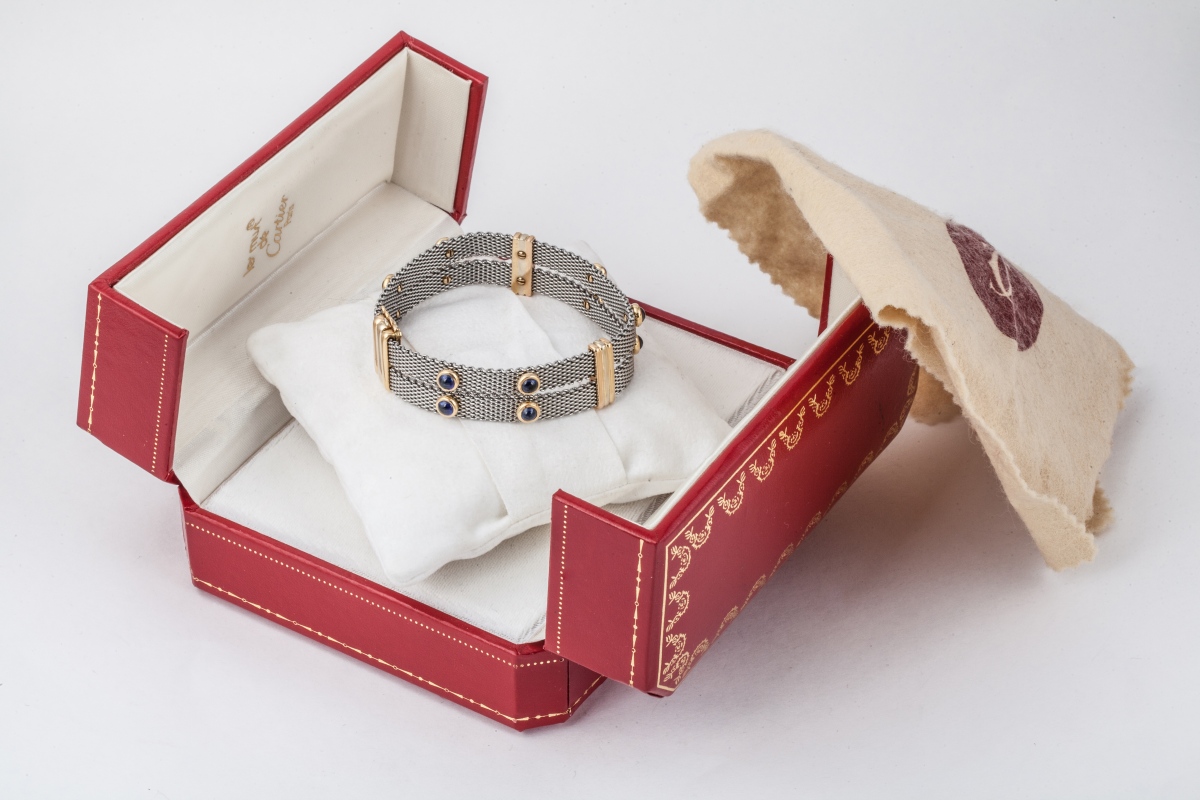 CARTIER. BRACELET à deux liens en acier tressés, ornés de 12 cabochons en saphirs bleus, réunis par trois anneaux trois ors, dont le fermoir. Numéroté 281887. Dans son écrin.
