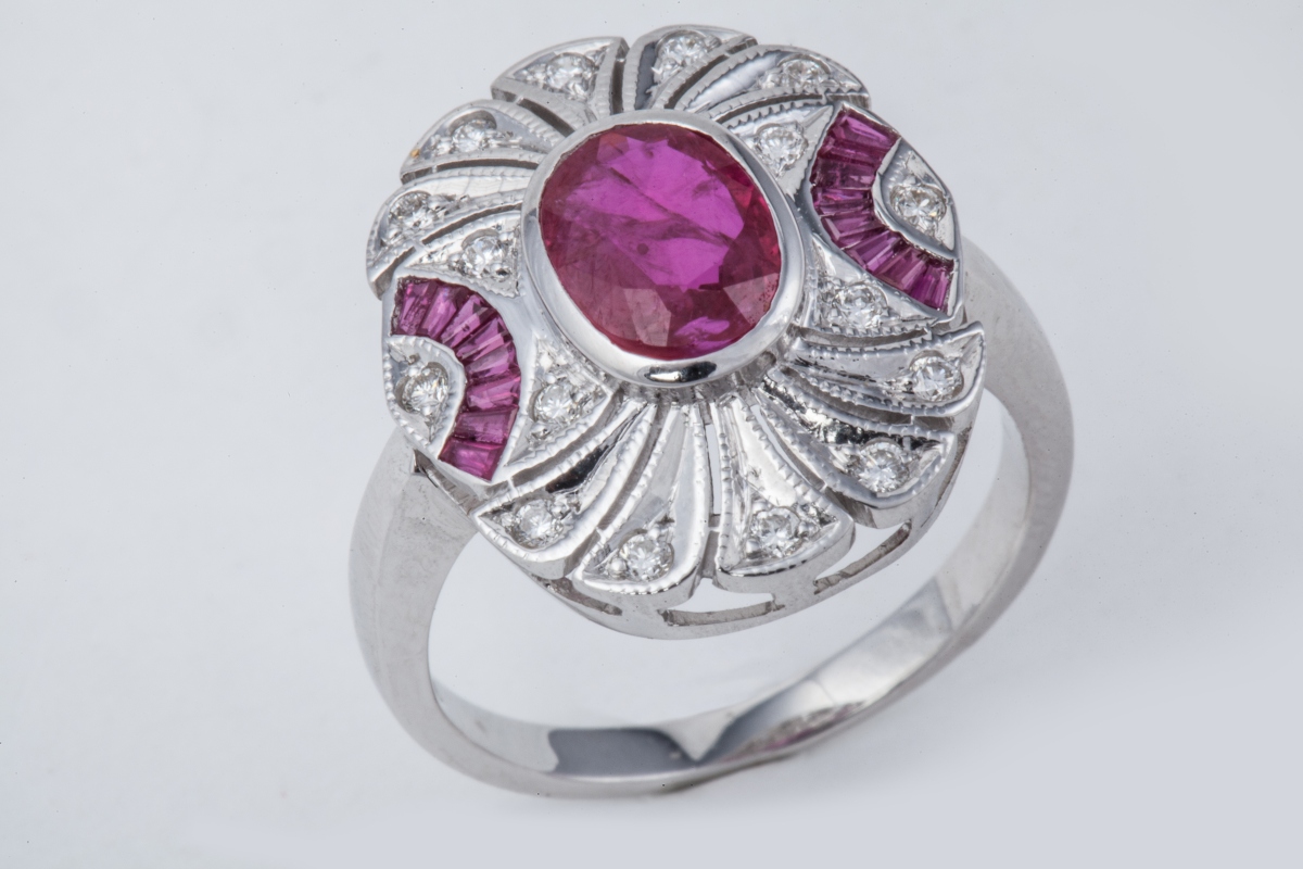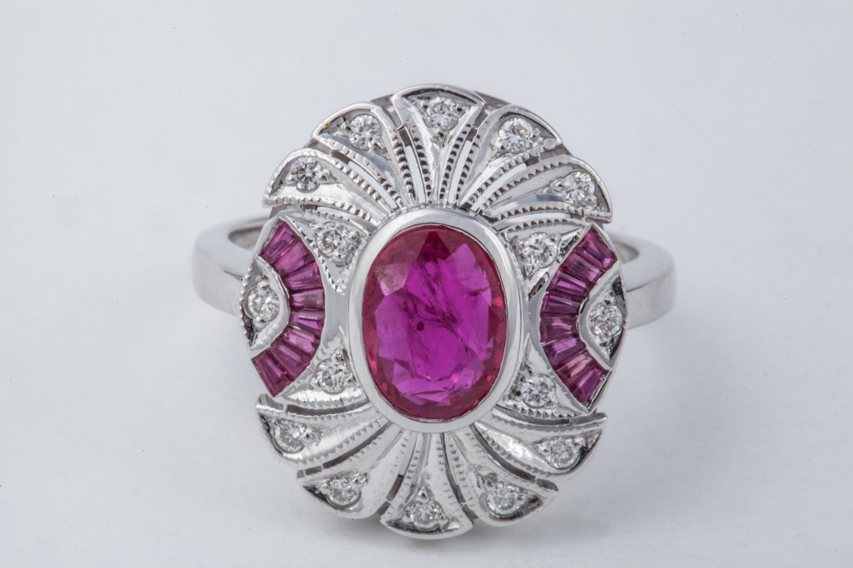 BAGUE de style NAPOLÉON III, en or rhodié, sertie d'un RUBIS taille ovale + 16 rubis taille calibré d'environ 2,05 carats agrémentés de 16 diamants blancs taille moderne d'environ 0,20 carat.