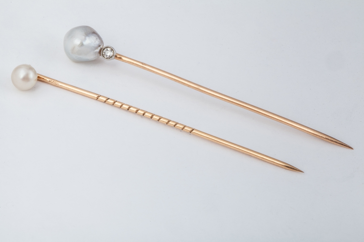 2 ÉPINGLES en or jaune ornée de deux perles baroques.