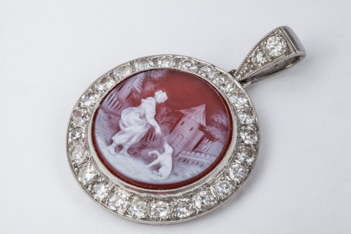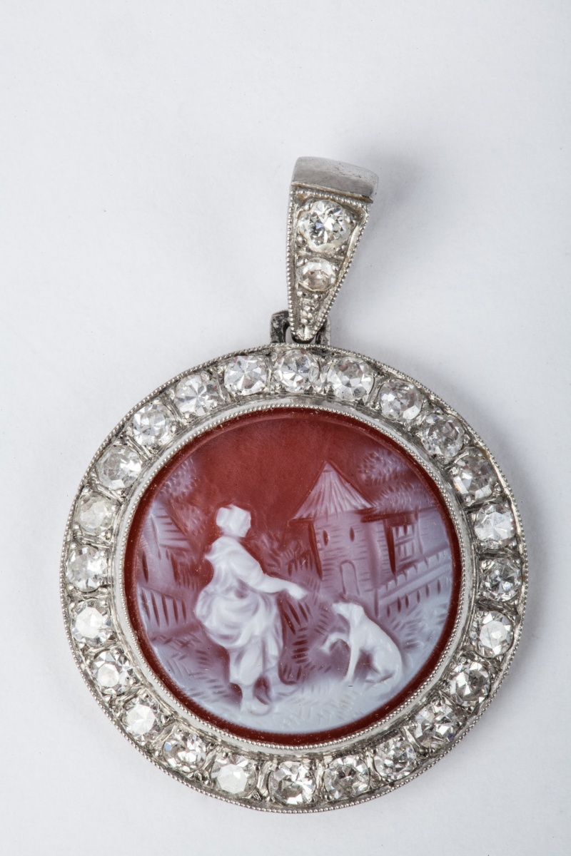 PENDENTIF en or blanc ou platine orné d'un CAMÉE pierre de forme circulaire figurant une jeune femme et un chien dans une ville moyen-âgeuse, dans un entourage pavé de brillants.