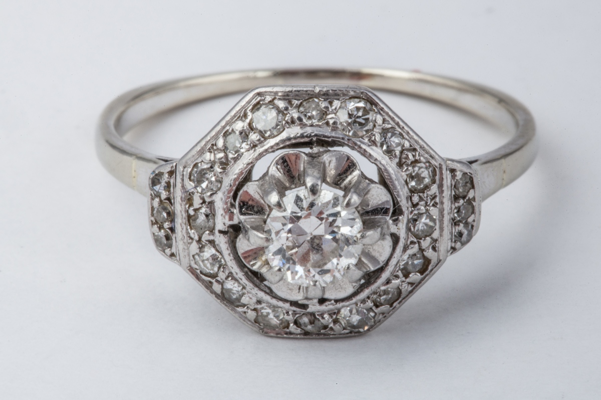 BAGUE en or gris 18K de forme géométrique ornée de DIAMANTS ronds taillés en huit huit, celui du centre plus important de taille brillant. (Marque de mise à grandeur).