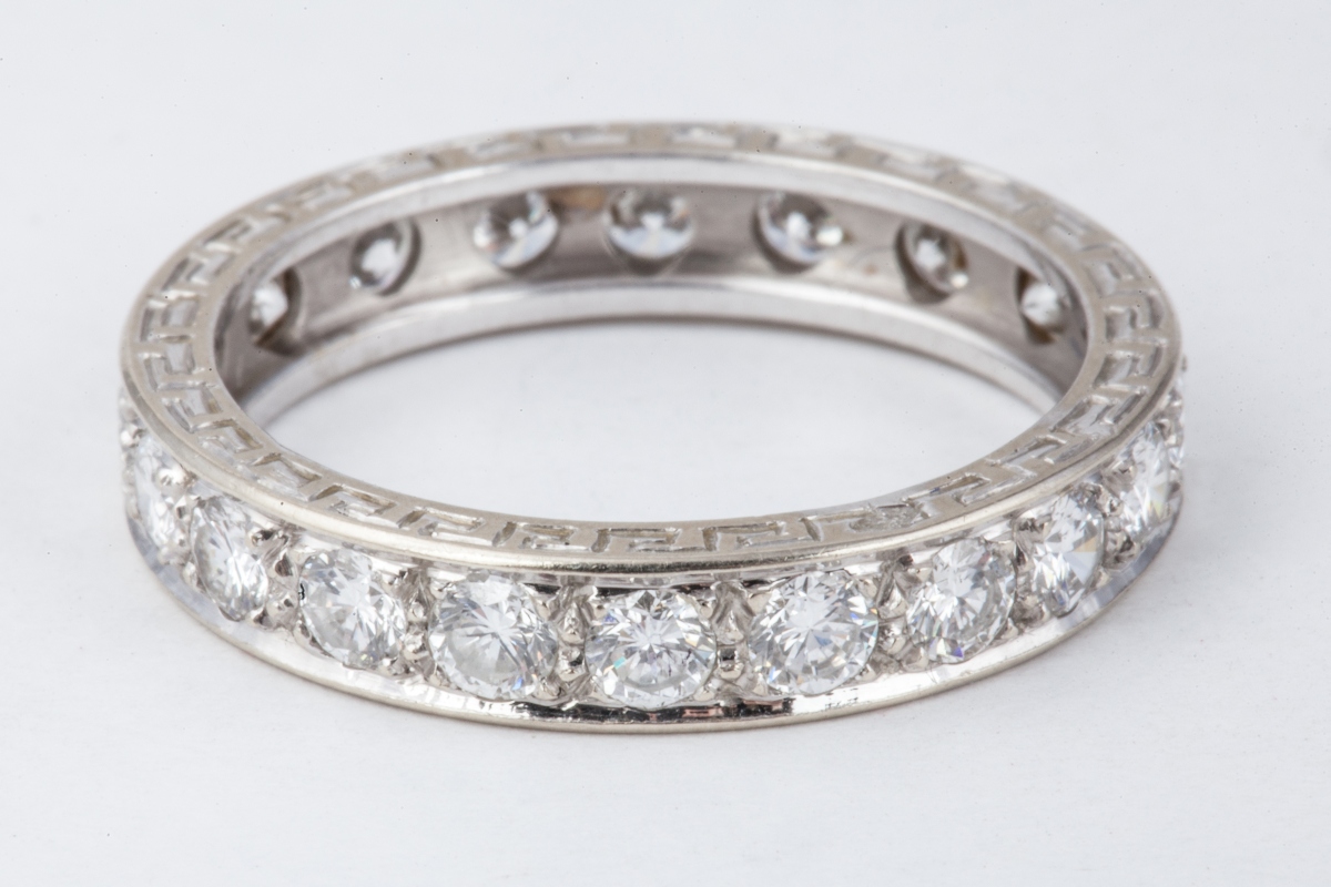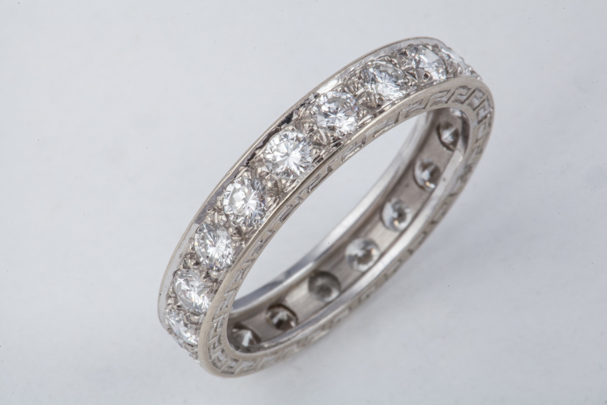 ALLIANCE AMÉRICAINE en or blanc ornée de 19 diamants taille brillant, les tranches ciselées de frises à la grecque.