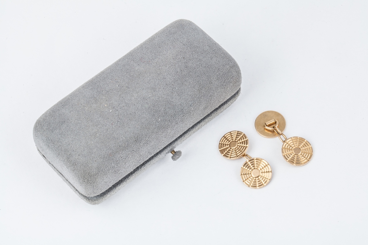 Paire de BOUTONS DE MANCHETTES en or jaune 18K, de forme ronde à décor rayonnant.