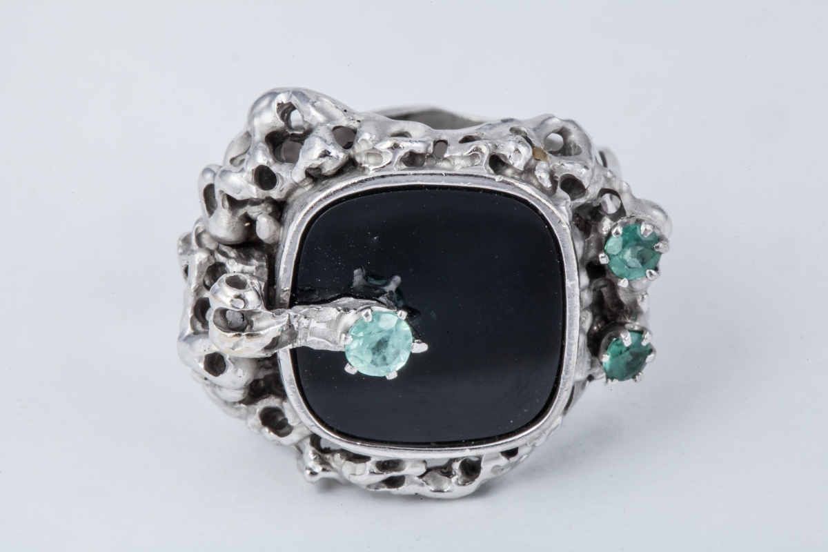 BAGUE stylisée en or gris 18K (750 millièmes), ornée au centre d'une plaque d'onyx de forme coussin, la monture gravée.