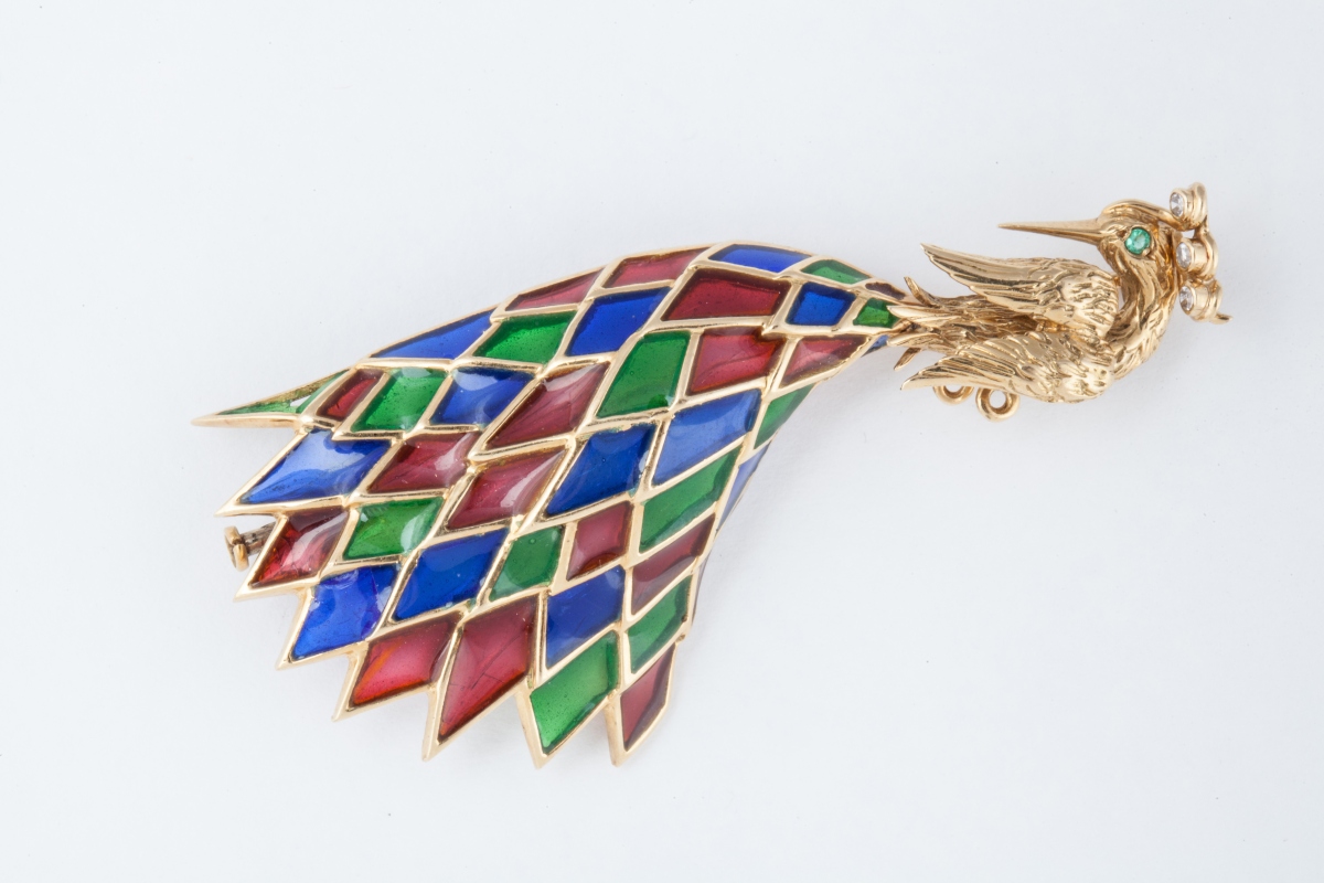 BROCHE figurant un oiseau de paradis, en or jaune 18K (750 millièmes) gravé, ornée de pâte de verre translucide.