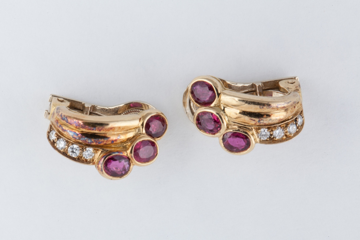 PAIRE DE BOUCLES D'OREILLE en or jaune 18K (750 millièmes), système à pince, chacune ornée de quatre petits diamants ronds et trois rubis ovales sertis clos.