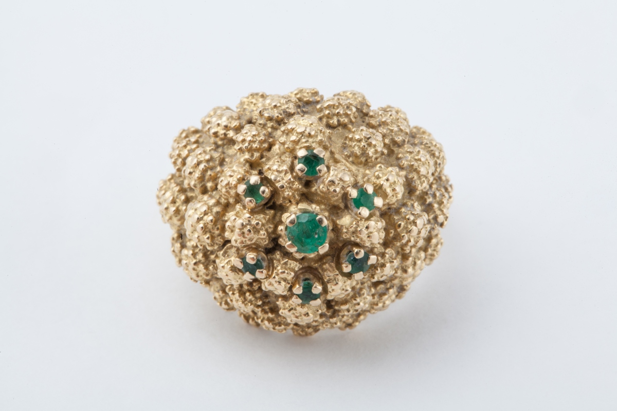 BAGUE BOULE en or jaune 18K (750 millièmes) gravé, ornée de petites émeraudes, celle du centre plus importante.