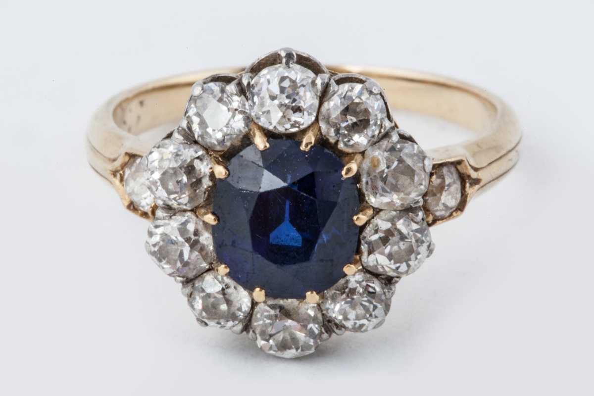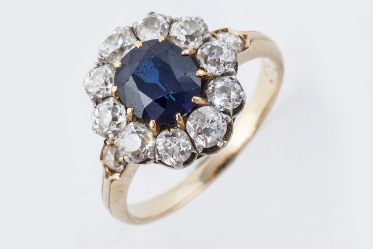BAGUE en or jaune 18K ornée d'un SAPHIR ovale dans un entourage de douze diamants ronds de taille ancienne.