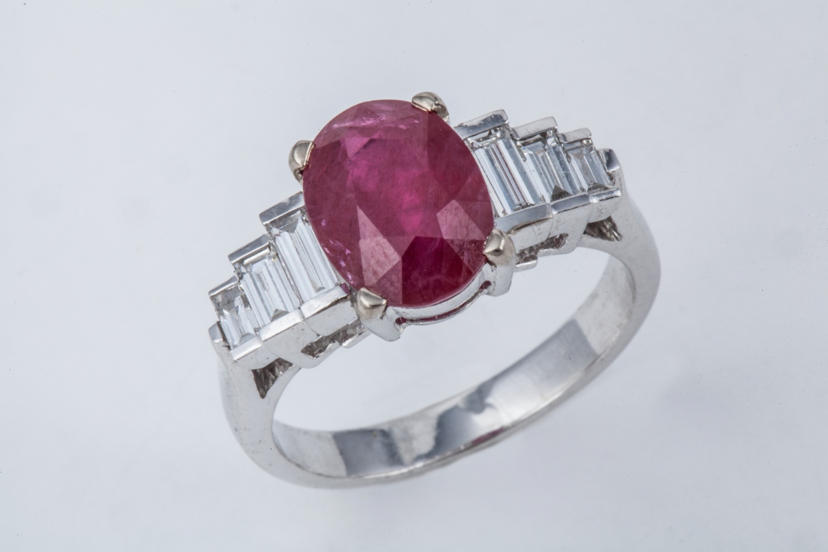 BAGUE en or blanc, ornée d'un RUBIS taille ovale d'environ 3,10 carats, épaulé de 2 X 3 diamants blancs taille baguette en chute d'environ 0,40 carat.
