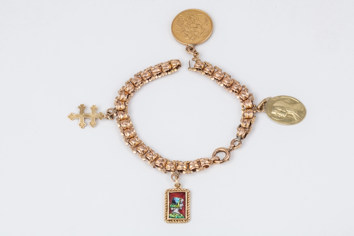 BRACELET articulé en or jaune 18K retenant en pampille quatre breloques (croix, pièce, médailles). (Accident au bracelet).