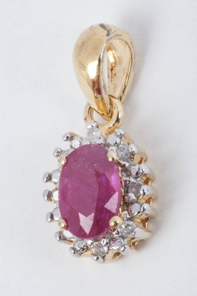 PENDENTIF en or jaune, serti d'un rubis ovale dans un entourage de petits diamants.