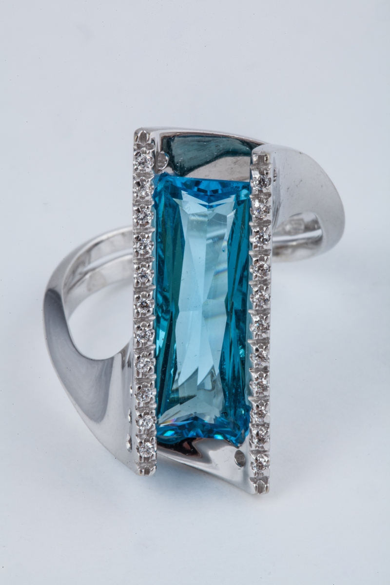BAGUE en or gris, de forme mouvementée, ornée au centre d'une pierre de synthèse bleue (verre) rectangulaire, entre deux lignes de pierres de synthèse blanche.
